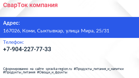 СварТок, компания по адресу 167026, Коми, Сыктывкар, улица Мира, 25/31 в дальнейшем Организация, размещена в следующих категориях: