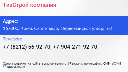 ТиаСтрой, компания по адресу 167000, Коми, Сыктывкар, Первомайская улица, 62 в дальнейшем Организация, размещена в следующих категориях: