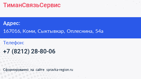 ТиманСвязьСервис по адресу 167016, Коми, Сыктывкар, Оплеснина, 54а в дальнейшем Организация, размещена в следующих категориях: