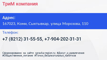 ТриМ, компания по адресу 167023, Коми, Сыктывкар, улица Морозова, 110 в дальнейшем Организация, размещена в следующих категориях: