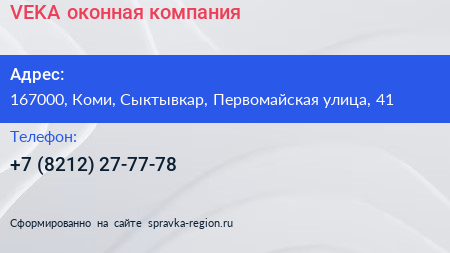 VEKA, оконная компания по адресу 167000, Коми, Сыктывкар, Первомайская улица, 41 в дальнейшем Организация, размещена в следующих категориях: