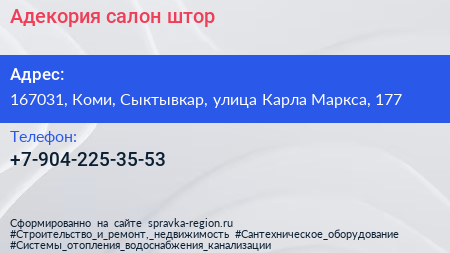 Адекория, салон штор по адресу 167031, Коми, Сыктывкар, улица Карла Маркса, 177 в дальнейшем Организация, размещена в следующих категориях: