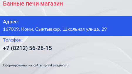 Банные печи, магазин по адресу 167009, Коми, Сыктывкар, Школьная улица, 29 в дальнейшем Организация, размещена в следующих категориях: