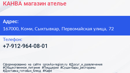 КАНВА, магазин-ателье по адресу 167000, Коми, Сыктывкар, Первомайская улица, 72 в дальнейшем Организация, размещена в следующих категориях: