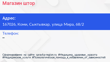 Магазин штор по адресу 167026, Коми, Сыктывкар, улица Мира, 68/2 в дальнейшем Организация, размещена в следующих категориях: