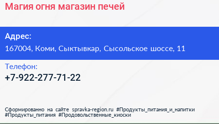 Магия огня, магазин печей по адресу 167004, Коми, Сыктывкар, Сысольское шоссе, 11 в дальнейшем Организация, размещена в следующих категориях:
