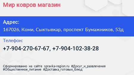 Мир ковров, магазин по адресу 167026, Коми, Сыктывкар, проспект Бумажников, 53д в дальнейшем Организация, размещена в следующих категориях: