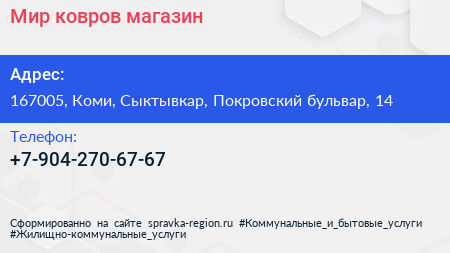 Мир ковров, магазин по адресу 167005, Коми, Сыктывкар, Покровский бульвар, 14 в дальнейшем Организация, размещена в следующих категориях: