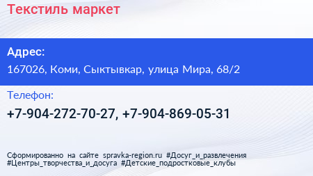 Текстиль маркет по адресу 167026, Коми, Сыктывкар, улица Мира, 68/2 в дальнейшем Организация, размещена в следующих категориях: