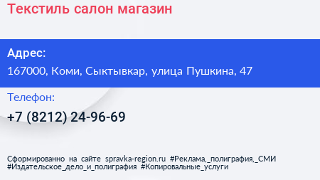Текстиль, салон-магазин по адресу 167000, Коми, Сыктывкар, улица Пушкина, 47 в дальнейшем Организация, размещена в следующих категориях: