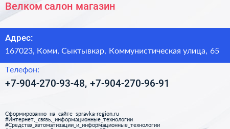 Велком, салон-магазин по адресу 167023, Коми, Сыктывкар, Коммунистическая улица, 65 в дальнейшем Организация, размещена в следующих категориях: