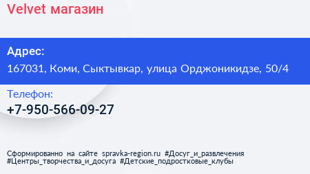 Velvet, магазин по адресу 167031, Коми, Сыктывкар, улица Орджоникидзе, 50/4 в дальнейшем Организация, размещена в следующих категориях: