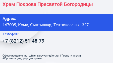 Храм Покрова Пресвятой Богородицы по адресу 167005, Коми, Сыктывкар, Тентюковская, 327 в дальнейшем Организация, размещена в следующих категориях: