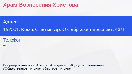 Храм Вознесения Христова по адресу 167001, Коми, Сыктывкар, Октябрьский проспект, 43/1 в дальнейшем Организация, размещена в следующих категориях: