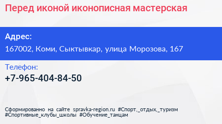 Перед иконой, иконописная мастерская по адресу 167002, Коми, Сыктывкар, улица Морозова, 167 в дальнейшем Организация, размещена в следующих категориях: