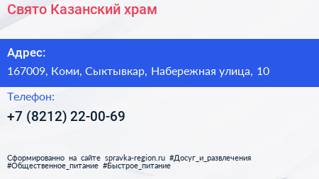 Свято-Казанский храм по адресу 167009, Коми, Сыктывкар, Набережная улица, 10 в дальнейшем Организация, размещена в следующих категориях: