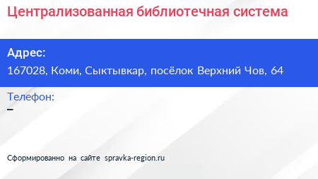 Централизованная библиотечная система по адресу 167028, Коми, Сыктывкар, посёлок Верхний Чов, 64 в дальнейшем Организация, размещена в следующих категориях: