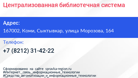 Централизованная библиотечная система по адресу 167002, Коми, Сыктывкар, улица Морозова, 164 в дальнейшем Организация, размещена в следующих категориях: