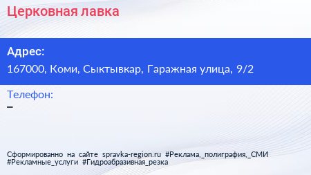 Церковная лавка по адресу 167000, Коми, Сыктывкар, Гаражная улица, 9/2 в дальнейшем Организация, размещена в следующих категориях: