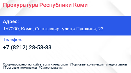 Прокуратура Республики Коми по адресу 167000, Коми, Сыктывкар, улица Пушкина, 23 в дальнейшем Организация, размещена в следующих категориях: