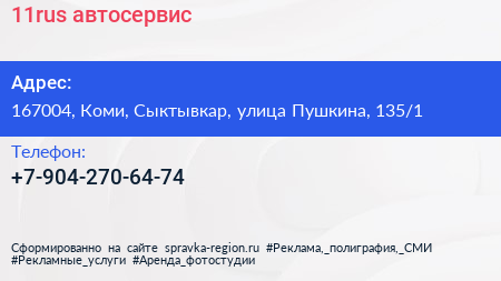 11rus, автосервис по адресу 167004, Коми, Сыктывкар, улица Пушкина, 135/1 в дальнейшем Организация, размещена в следующих категориях: