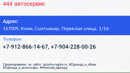 444, автосервис по адресу 167009, Коми, Сыктывкар, Пермская улица, 1/16 в дальнейшем Организация, размещена в следующих категориях: