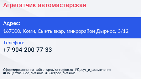 Агрегатчик, автомастерская по адресу 167000, Коми, Сыктывкар, микрорайон Дырнос, 3/12 в дальнейшем Организация, размещена в следующих категориях: