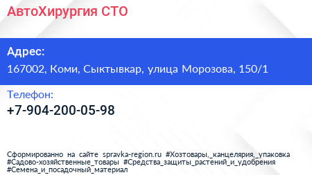 АвтоХирургия, СТО по адресу 167002, Коми, Сыктывкар, улица Морозова, 150/1 в дальнейшем Организация, размещена в следующих категориях: