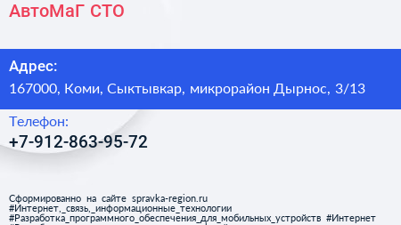АвтоМаГ, СТО по адресу 167000, Коми, Сыктывкар, микрорайон Дырнос, 3/13 в дальнейшем Организация, размещена в следующих категориях: