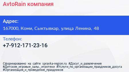 AvtoRain, компания по адресу 167000, Коми, Сыктывкар, улица Ленина, 48 в дальнейшем Организация, размещена в следующих категориях: