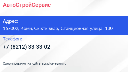 АвтоСтройСервис по адресу 167002, Коми, Сыктывкар, Станционная улица, 130 в дальнейшем Организация, размещена в следующих категориях: