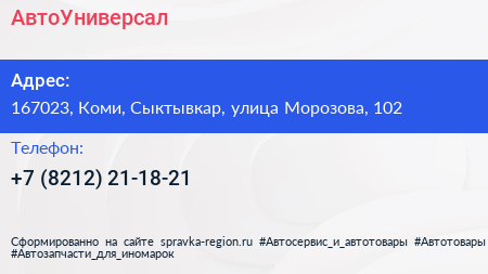АвтоУниверсал по адресу 167023, Коми, Сыктывкар, улица Морозова, 102 в дальнейшем Организация, размещена в следующих категориях: