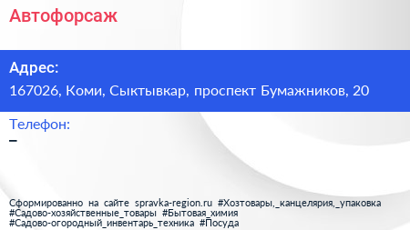 Автофорсаж по адресу 167026, Коми, Сыктывкар, проспект Бумажников, 20 в дальнейшем Организация, размещена в следующих категориях:
