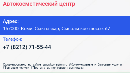 Автокосметический центр по адресу 167000, Коми, Сыктывкар, Сысольское шоссе, 67 в дальнейшем Организация, размещена в следующих категориях: