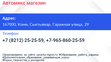 Автомикс, магазин по адресу 167000, Коми, Сыктывкар, Гаражная улица, 29 в дальнейшем Организация, размещена в следующих категориях: