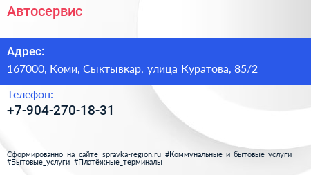 Автосервис по адресу 167000, Коми, Сыктывкар, улица Куратова, 85/2 в дальнейшем Организация, размещена в следующих категориях: