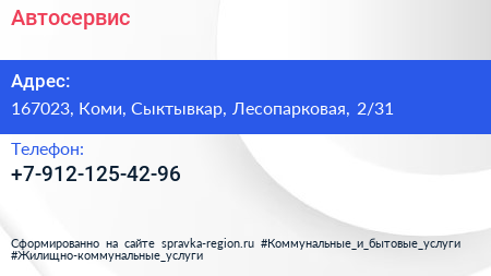 Автосервис по адресу 167023, Коми, Сыктывкар, Лесопарковая, 2/31 в дальнейшем Организация, размещена в следующих категориях: