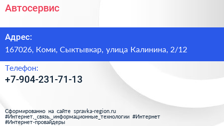 Автосервис по адресу 167026, Коми, Сыктывкар, улица Калинина, 2/12 в дальнейшем Организация, размещена в следующих категориях: