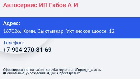 Автосервис, ИП Габов А. И. по адресу 167026, Коми, Сыктывкар, Ухтинское шоссе, 12 в дальнейшем Организация, размещена в следующих категориях: