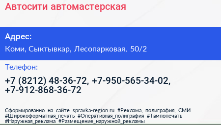 Автосити, автомастерская по адресу Коми, Сыктывкар, Лесопарковая, 50/2 в дальнейшем Организация, размещена в следующих категориях:
