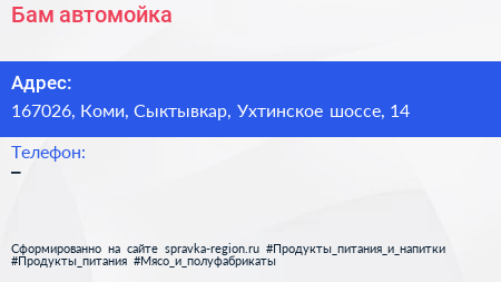 Бам, автомойка по адресу 167026, Коми, Сыктывкар, Ухтинское шоссе, 14 в дальнейшем Организация, размещена в следующих категориях:
