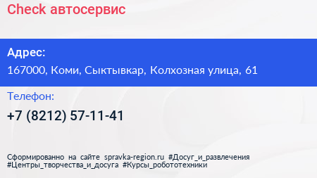 Check, автосервис по адресу 167000, Коми, Сыктывкар, Колхозная улица, 61 в дальнейшем Организация, размещена в следующих категориях: