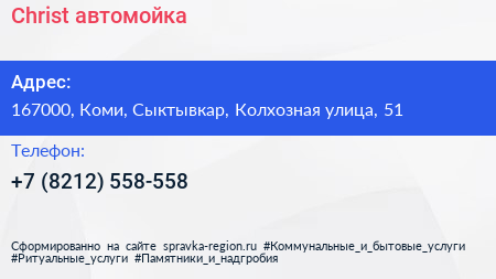 Christ, автомойка по адресу 167000, Коми, Сыктывкар, Колхозная улица, 51 в дальнейшем Организация, размещена в следующих категориях: