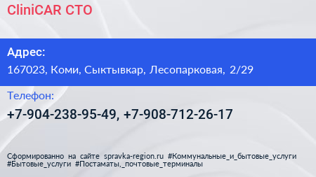 CliniCAR, СТО по адресу 167023, Коми, Сыктывкар, Лесопарковая, 2/29 в дальнейшем Организация, размещена в следующих категориях: