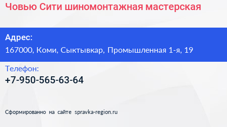 Човью-Сити, шиномонтажная мастерская по адресу 167000, Коми, Сыктывкар, Промышленная 1-я, 19 в дальнейшем Организация, размещена в следующих категориях: