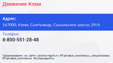 Движение-Коми по адресу 167000, Коми, Сыктывкар, Сысольское шоссе, 29/4 в дальнейшем Организация, размещена в следующих категориях: