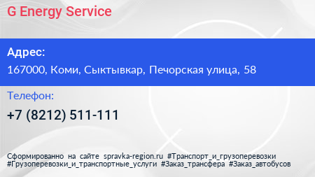 G-Energy Service по адресу 167000, Коми, Сыктывкар, Печорская улица, 58 в дальнейшем Организация, размещена в следующих категориях: