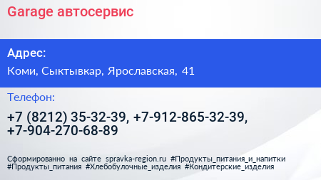 Garage, автосервис по адресу Коми, Сыктывкар, Ярославская, 41 в дальнейшем Организация, размещена в следующих категориях: