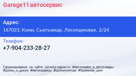 Garage11, автосервис по адресу 167023, Коми, Сыктывкар, Лесопарковая, 2/24 в дальнейшем Организация, размещена в следующих категориях: