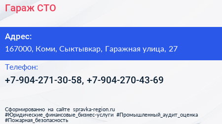 Гараж, СТО по адресу 167000, Коми, Сыктывкар, Гаражная улица, 27 в дальнейшем Организация, размещена в следующих категориях: